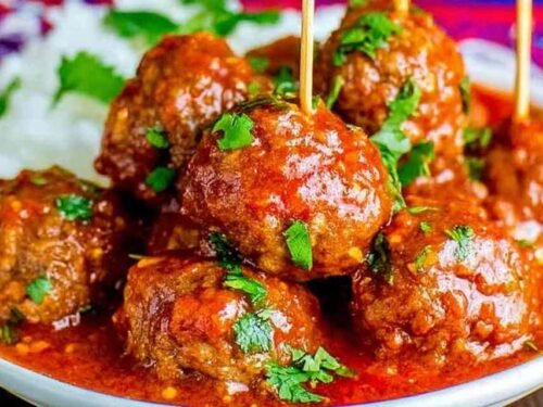 Taco Rice Bowl: Build a full taco rice bowl with these meatballs on top, shredded cheese, sour cream, and fresh salsa. It is a fun way to serve them on busy nights when everyone wants to customize their own plate.