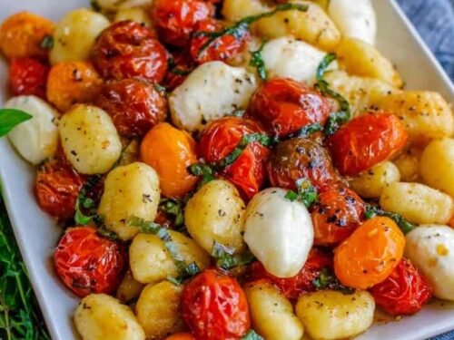 Golden oven-roasted gnocchi with burst cherry tomatoes and creamy marinated mozzarella, all cooked on one pan in about 22 minutes. Finished with fresh basil, Parmesan, and balsamic vinegar for a fast, flavorful weeknight dinner.